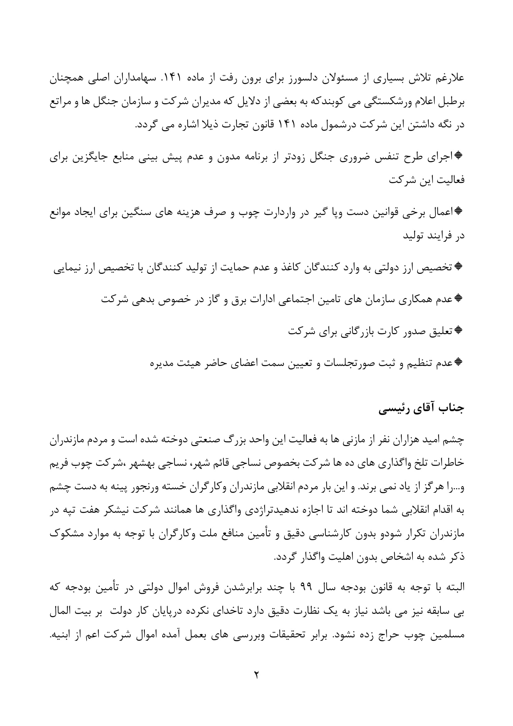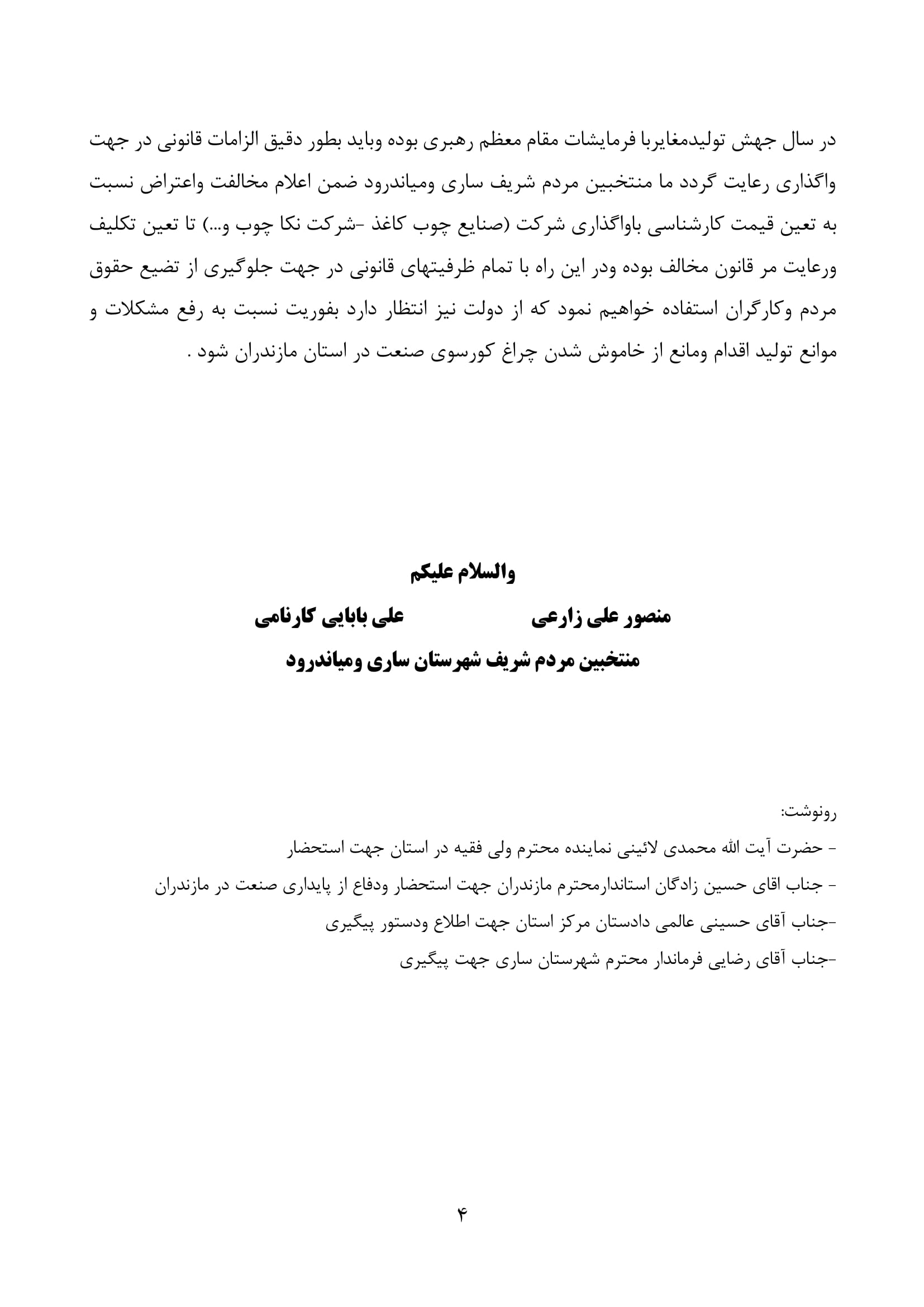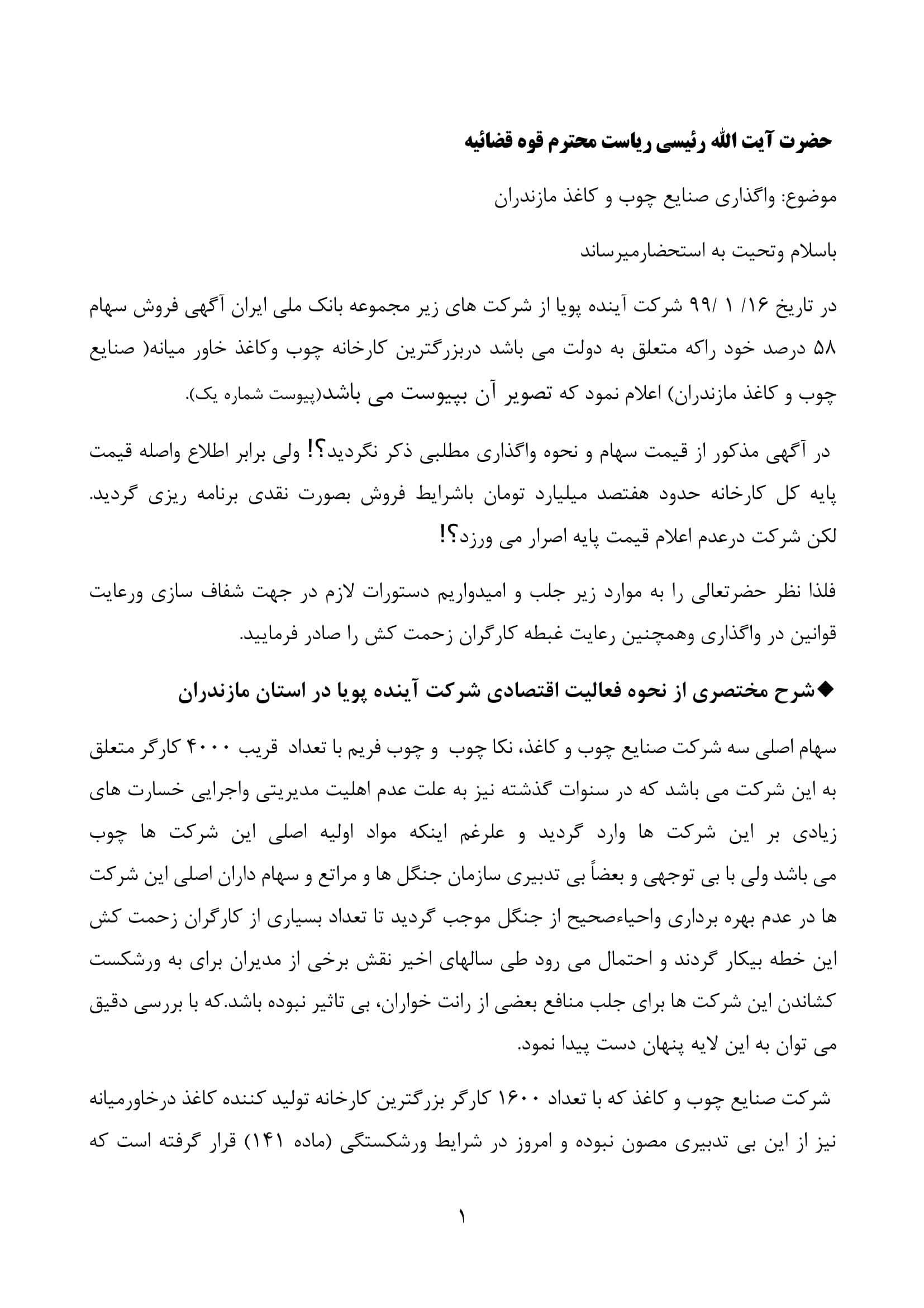 نامه دکتر بابایی کارنامی و جناب آقای زارعی، منتخبان مردم شریف شهرستان های ساری و میاندورود در مجلس یازدهم به ریاست محترم قوه قضائیه درباره نحوه واگذاری کارخانه صنایع چوب و کاغذ مازندران